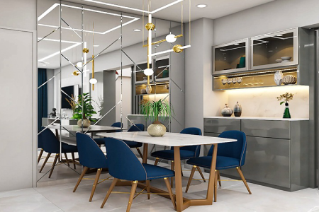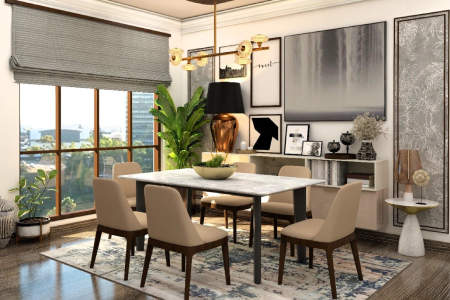 Modern Dining Room Design with Marble Table and Upholstered Chairs