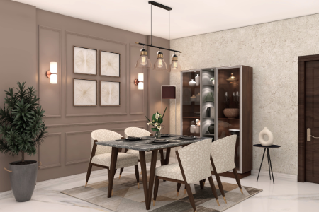Wood-Finished Dining Area with Crockery Cabinet & Pendant Lamps
