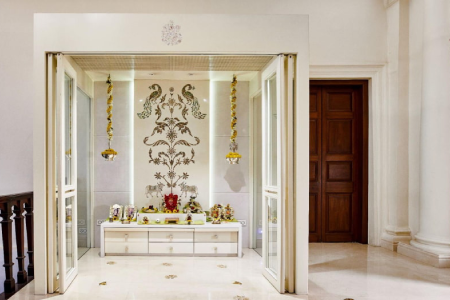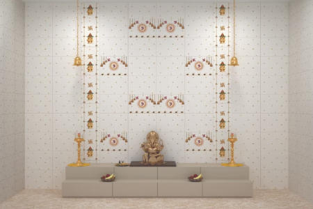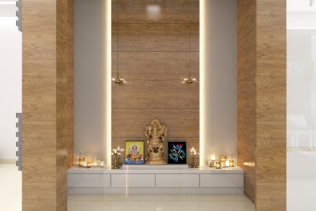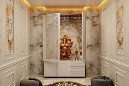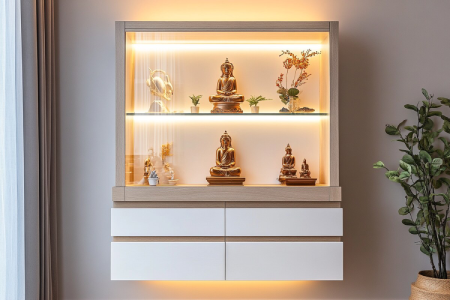 Wall-mounted mandir units, corner niches, or built-in cabinetry for apartments and compact homes. -